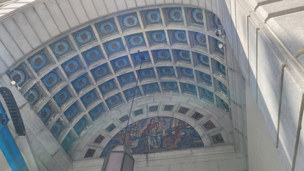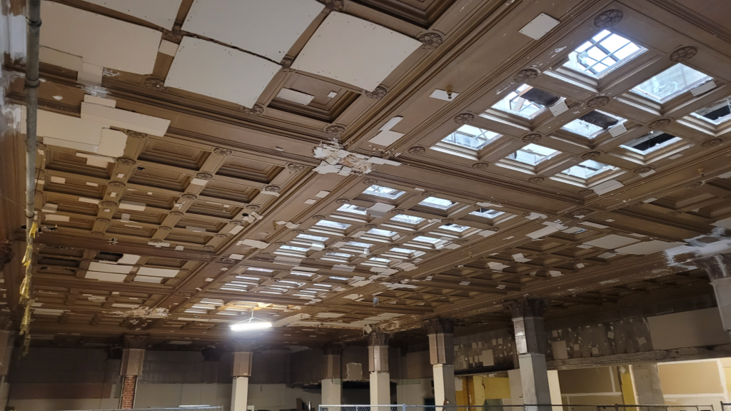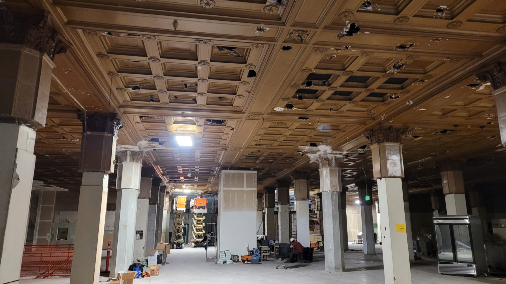 Over the years, the ceiling of the once-grand Subway Terminal building at 417 South Hill St had deteriorated significantly due to neglect. Dating back to 1926, the historic plaster had suffered extensive water damage, resulting in loose and flaky paint that had mostly separated from the surface.